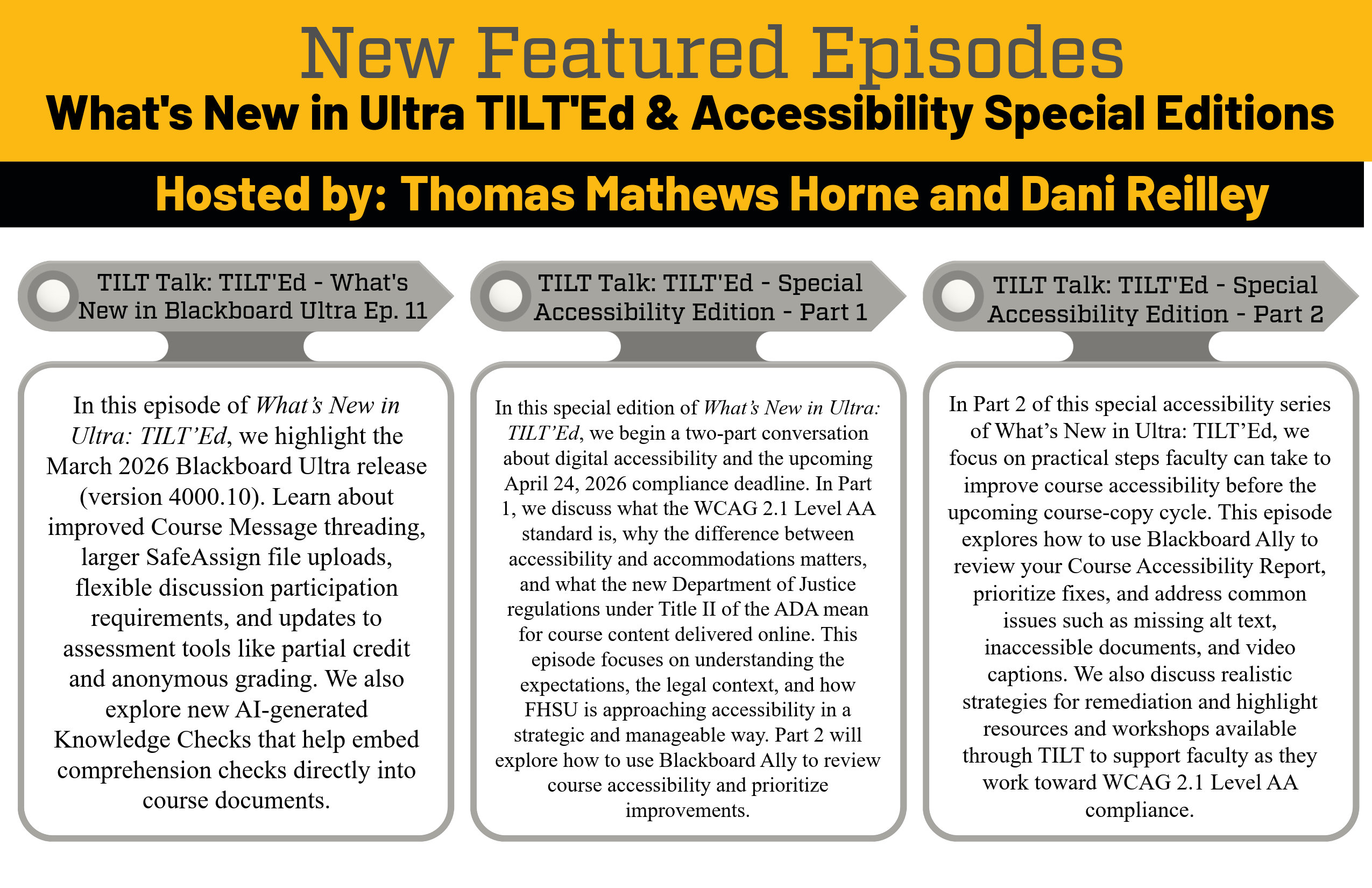 What’s New in Ultra: TILT’ed is your monthly guide to the latest updates and features in Blackboard Ultra, hosted by Thomas Mathews Horne and Danielle Reilley from Fort Hays State University’s Teaching Innovation and Learning Technologies (TILT) team. Each episode breaks down the newest release highlights in clear, practical terms—showing how small changes can make a big impact on teaching, learning, and course design. From gradebook improvements and communication tools to AI features and accessibility updates, Thomas and Dani help faculty stay informed, save time, and make the most of Ultra’s evolving capabilities. Whether you’re a seasoned online instructor or just getting started, this podcast keeps you connected to what’s new, what’s next, and what works in digital teaching.